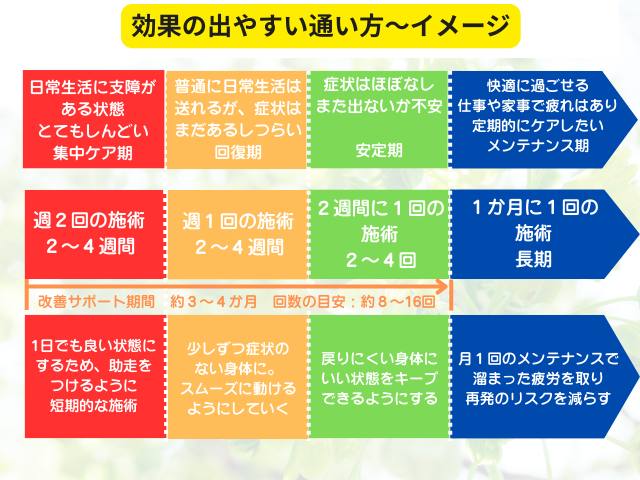 当院は適切な通院間隔と、適切な施術法で1日でも早く改善してもらうよう最適な方法を提案いたします。