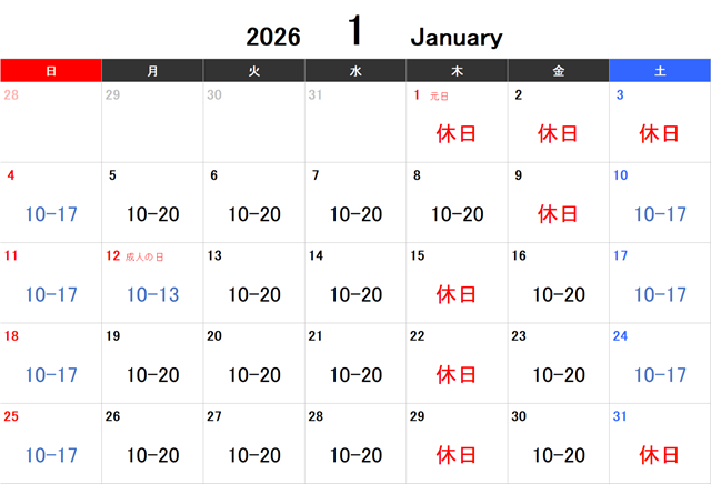 1日~3日、9日(金)、15日(木)、22日(木)、29日(木)、31日(土)