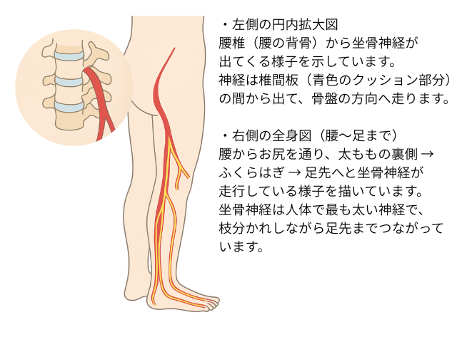坐骨神経は腰からお尻、足にかけて伸びている長い神経です。