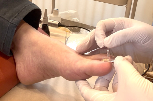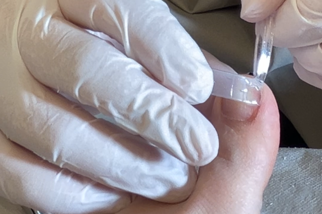 合成樹脂のプレートを装着して、巻き爪部分をゆっくり持ち上げます。
